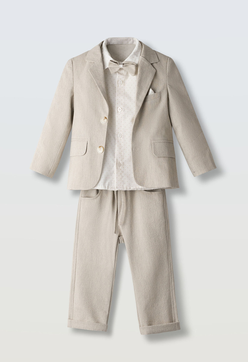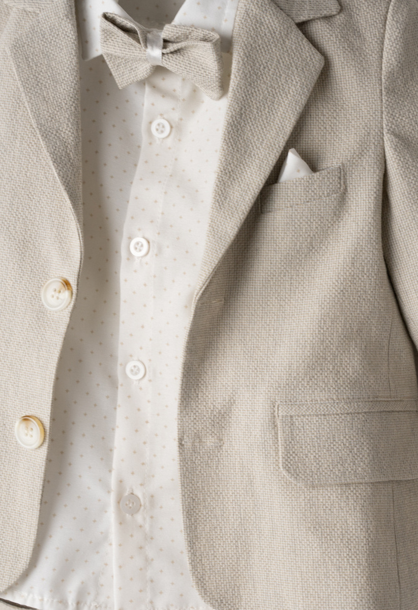 Σετ 3 τεμ. HASHTAG, σακάκι σε χρώμα μπεζ με διακοσμητικό μαντήλι, βαμβακερό πουκάμισο σε λευκό χρώμα με πουά σχέδιο και παντελόνι με γυρισμένο ρεβέρ σε χρώμα μπεζ και εσωτερικά ρυθμιζόμενο λάστιχο μέσης. Διαθέτει ασορτί αποσπώμενο παπιγιόν.