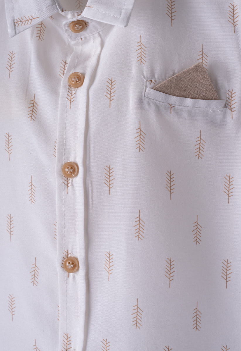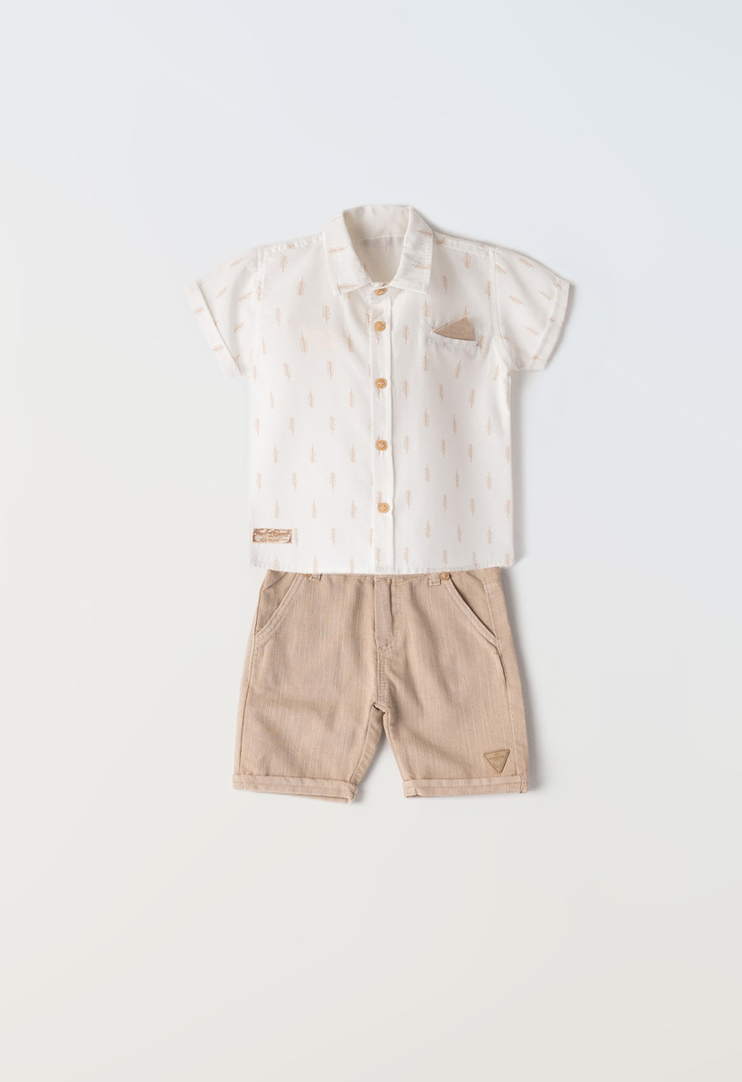 Σετ 2 τεμ. HASHTAG, κοντομάνικο βαμβακερό πουκάμισο σε χρώμα λευκό με all over τύπωμα και διακοσμητικό μαντήλι στην μπροστινή τσέπη, βερμούδα σε χρώμα μπεζ, κούμπωμα με φερμουαρ και ασορτι αποσπώμενες τιράντες.
