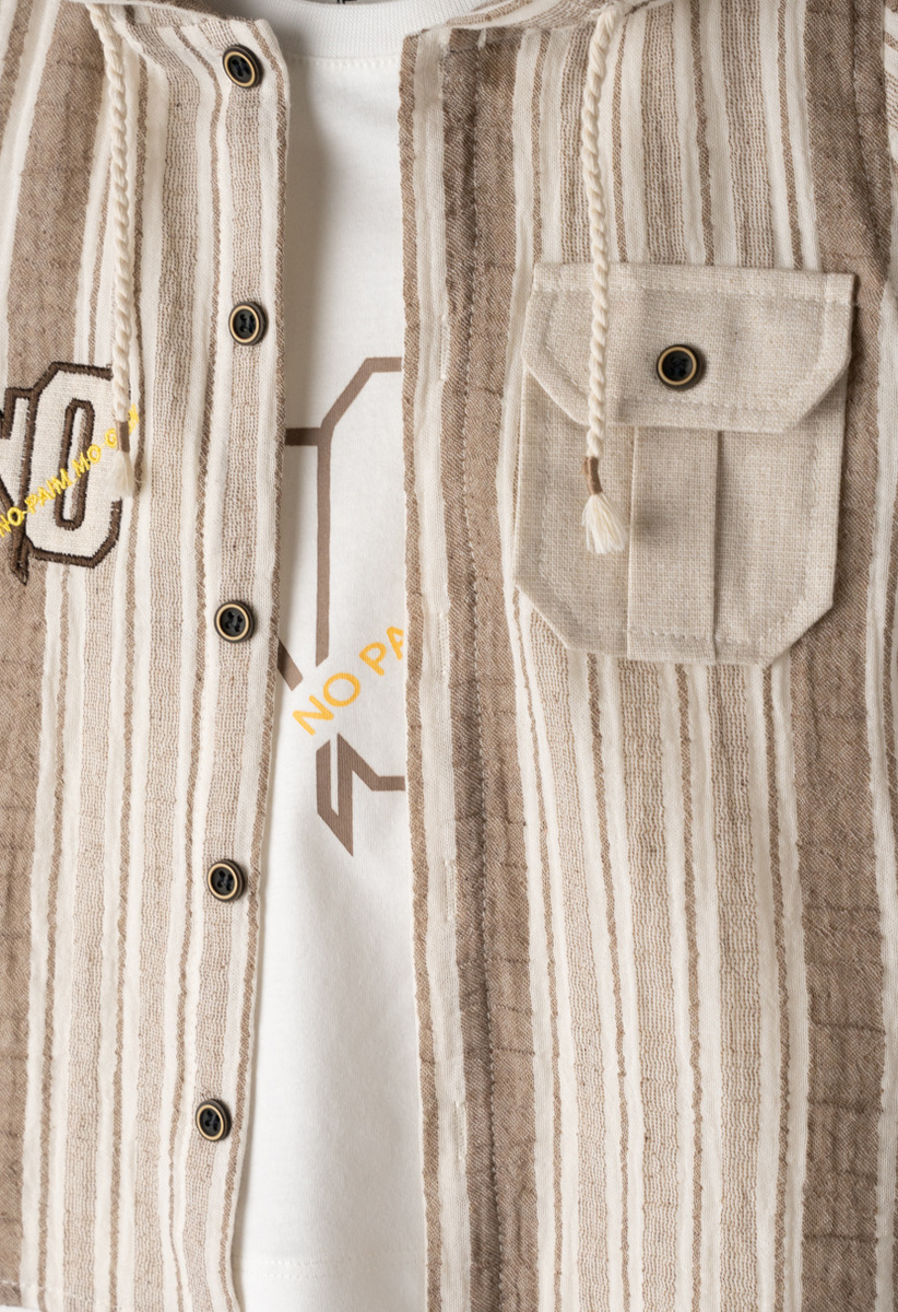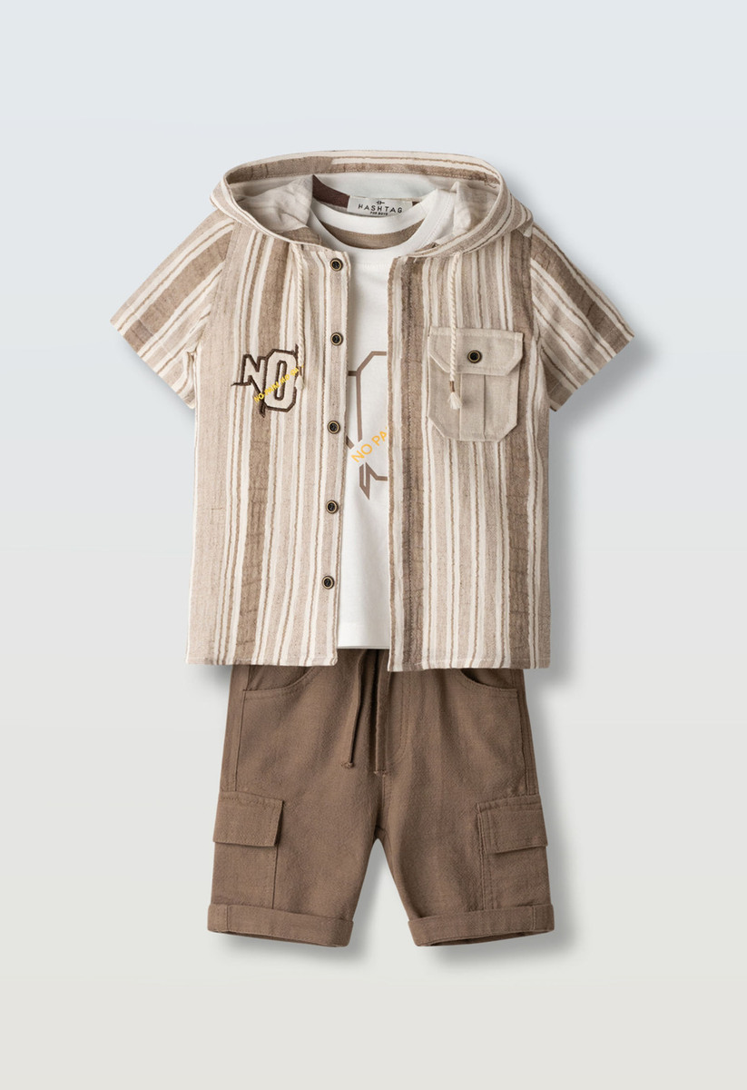 Σετ 3 τμχ. βερμούδα HASHTAG, πουκάμισο με ριγέ σχέδιο σε χρώμα μπεζ-εκρού, μπλούζα βαμβακερή σε χρώμα λευκό και βερμούδα με λάστιχο, εσωτερικό ρυθμιζόμενο κορδόνι μέσης σε χρώμα καφέ.