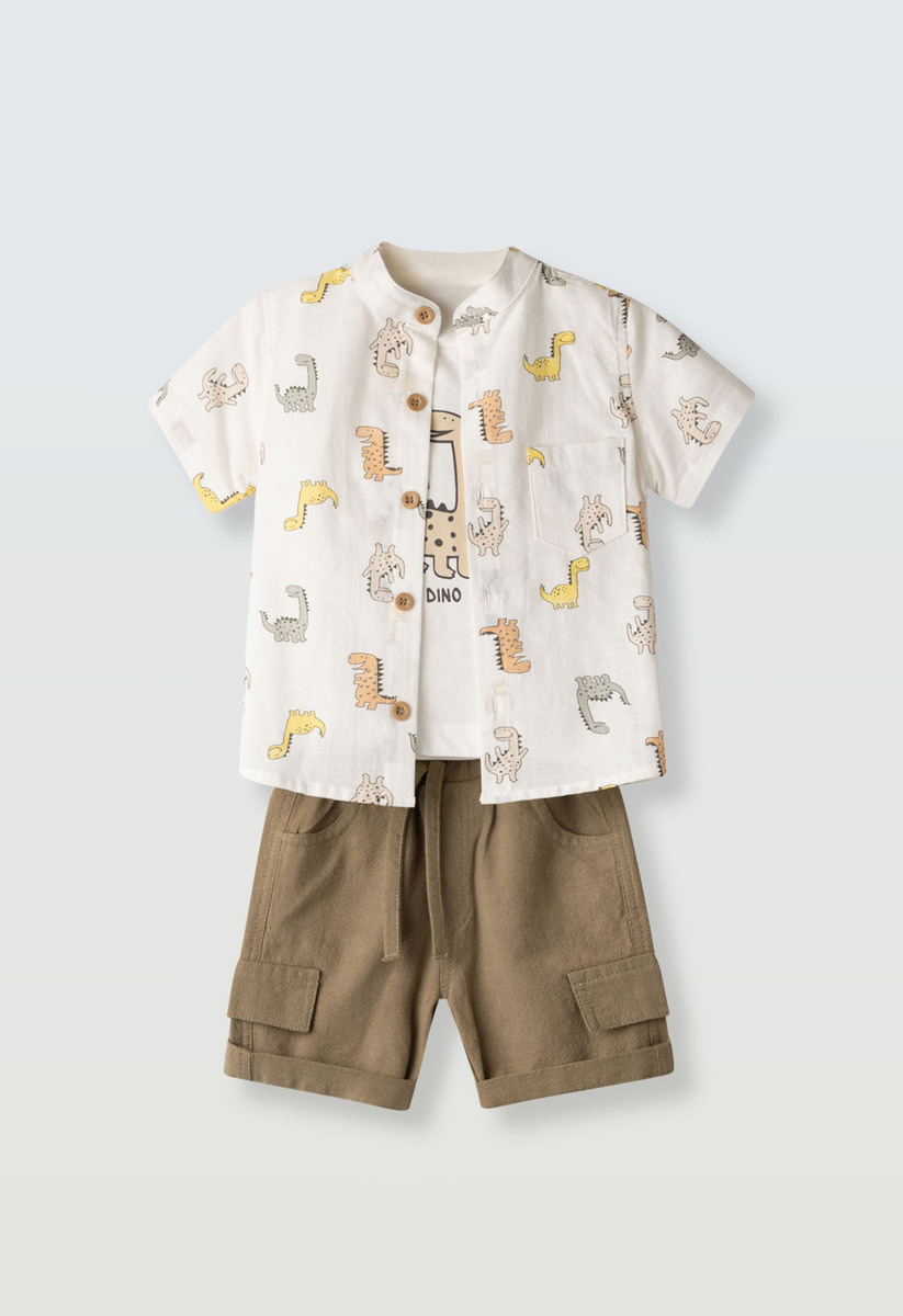 Σετ 3 τεμ. HASHTAG, πουκάμισο με γιακά τύπου μάο σε χρώμα εκρού, all-over τύπωμα δεινοσαύρους, μπλούζα βαμβακερή σε χρώμα λευκό με τύπωμα στο μπροστινό μέρος. Βερμούδα σε χρώμα καφέ με πλαινές τσέπες τύπου cargo και λάστιχο στη μέση.