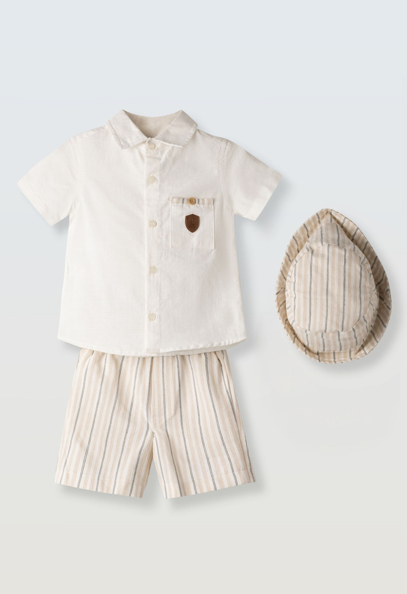 Σετ 2 τεμ. HASHTAG, πουκάμισο σε χρώμα εκρού και βερμούδα σε χρώμα εκρού με ριγέ τύπωμα. Διαθέτει ασορτί καπέλο.