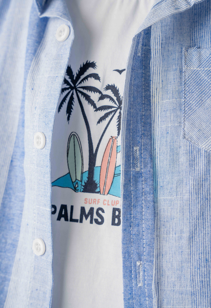 Σετ 3 τεμ. HASHTAG, ριγέ πουκάμισο σε χρώμα σιέλ, κοντομάνικη μπλούζα σε χρώμα λευκό με τύπωμα στο μπροστινό μέρος και τζιν βερμούδα με αποσπώμενες τιράντες και άνετη εφαρμογή.
