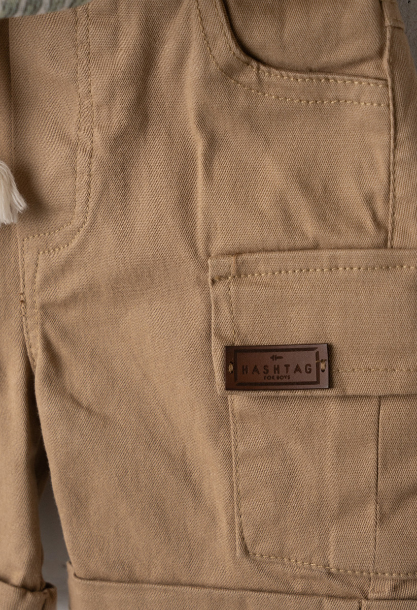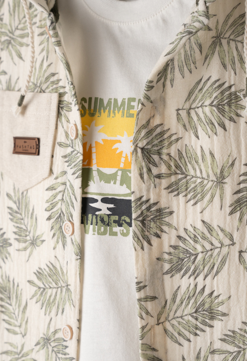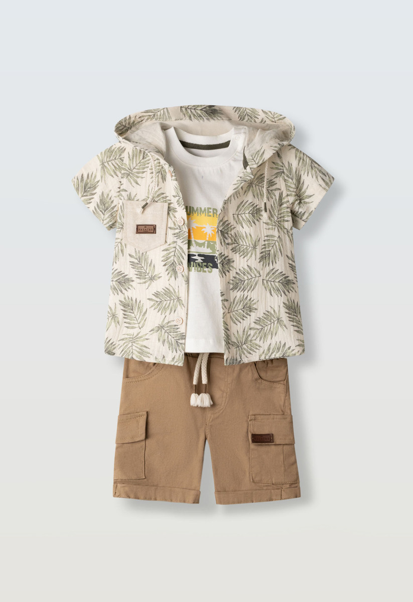 Σετ 3 τεμ. HASHTAG, πουκάμισο εμπριμέ με ενσωματωμένη κουκούλα, μπλούζα με τύπωμα στο μπροστινό μέρος σε χρώμα λευκό και βερμούδα σε χρώμα καφέ με πλαινές τσέπες τύπου cargo.