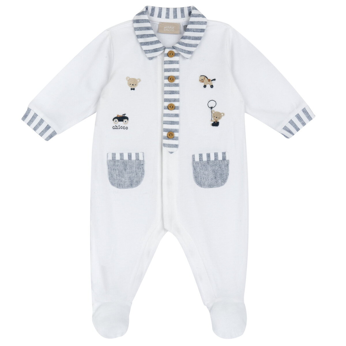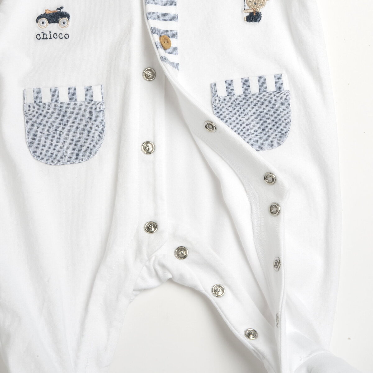 Βαμβακερό φορμάκι CHICCO σε χρώμα λευκό με ριγέ γιακαδάκι, δύο διακοσμητικές εξωτερικές τσέπες και κεντημένα απλικέ σχέδια. Διαθέτει κούμπωμα με τρουκς στο μπροστινό μέρος.