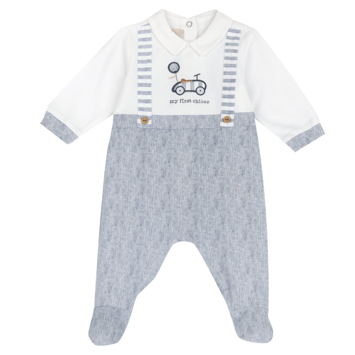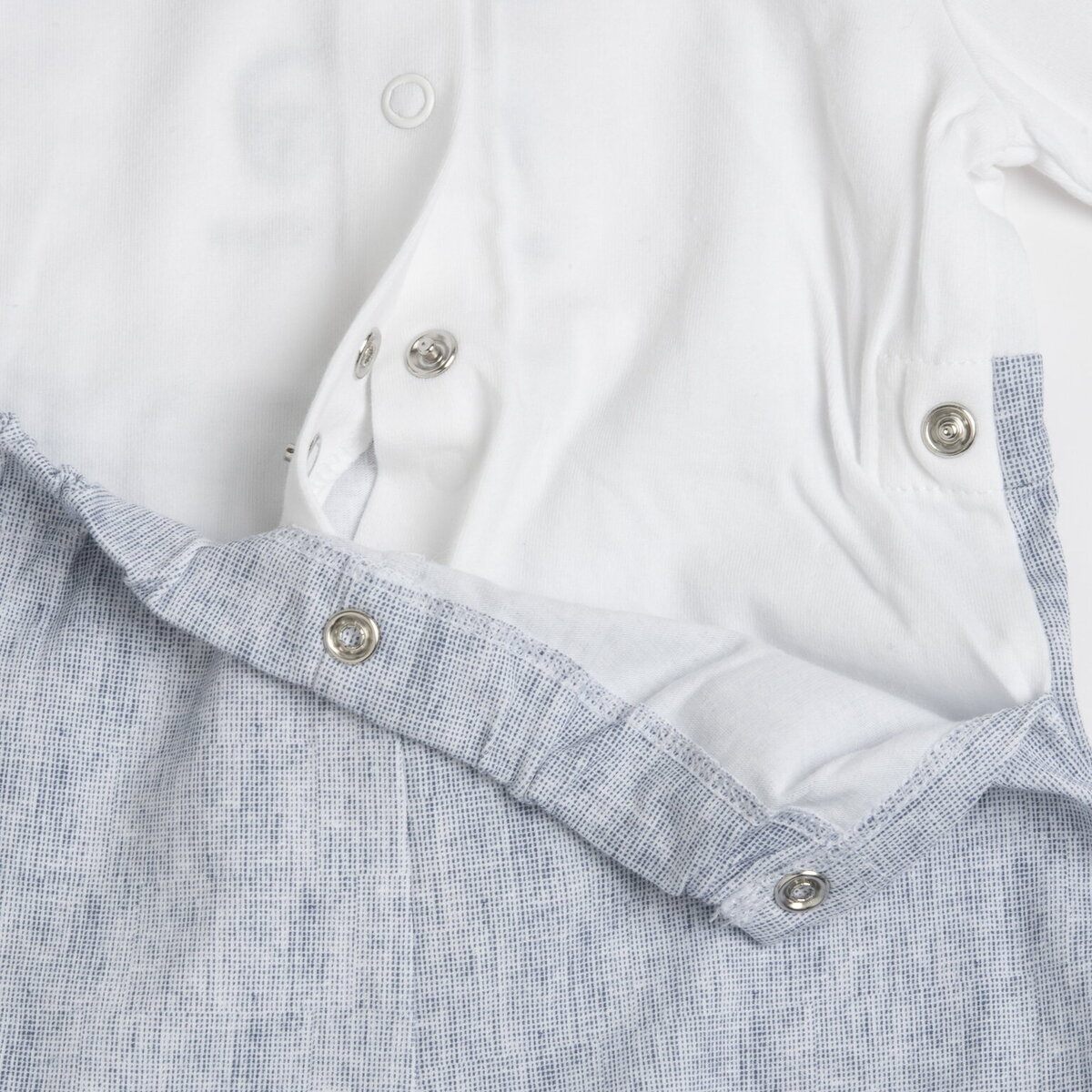 Βαμβακερό φορμάκι CHICCO σε χρώμα λευκό με μπλε, γιακαδάκι και δύο διακοσμητικές ενσωματωμένες τιράντες. Διαθέτει κούμπωμα με τρουκς στο πίσω μέρος.