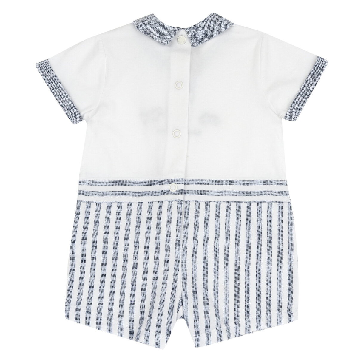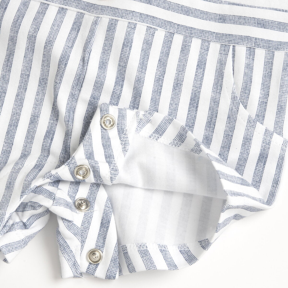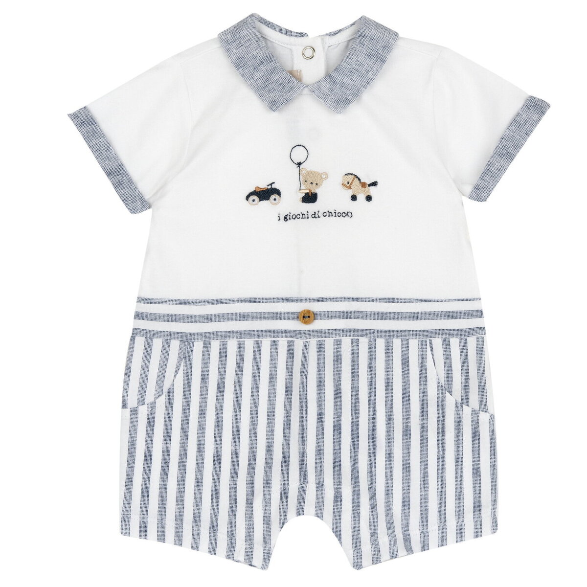 Βαμβακερό φορμάκι CHICCO σε χρώμα λευκό-μπλε με ριγέ σχέδιο στο κάτω μέρος, κοντό μανίκι και γιακαδάκι. Διαθέτει κούμπωμα με τρουκς στο πίσω μέρος.