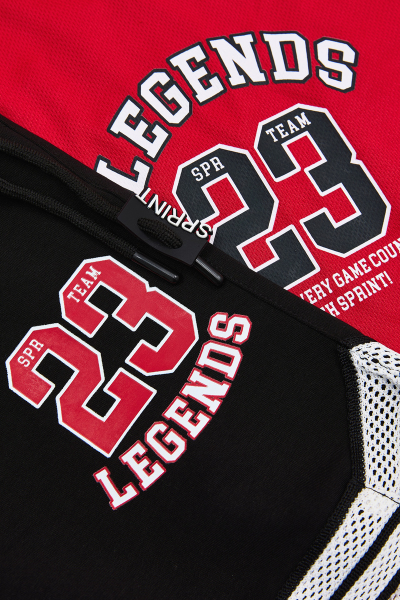 Σετ SPRINT, μπλούζα αμάνικη σε χρώμα κόκκινο με τύπωμα στο μπροστινό μέρος και βερμούδα με λάστιχο και ρυθμιζόμενο κορδόνι στη μέση σε χρώμα μαύρο. Διαθέτει δύο μπροστινές εσωτερικές τσέπες.