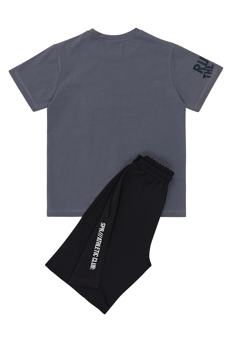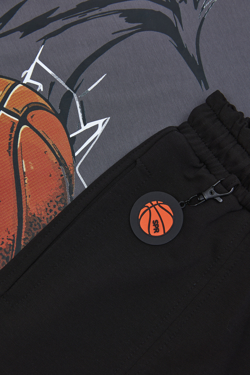 Βαμβακερό σετ SPRINT, μπλούζα σε χρώμα γκρι με τύπωμα μπάσκετ και βερμούδα με λάστιχο και ρυθμιζόμενο κορδόνι στη μέση σε χρώμα μαύρο, με δύο μπροστινές εσωτερικές τσέπες. Διαθέτει ασορτί μπρελόκ.