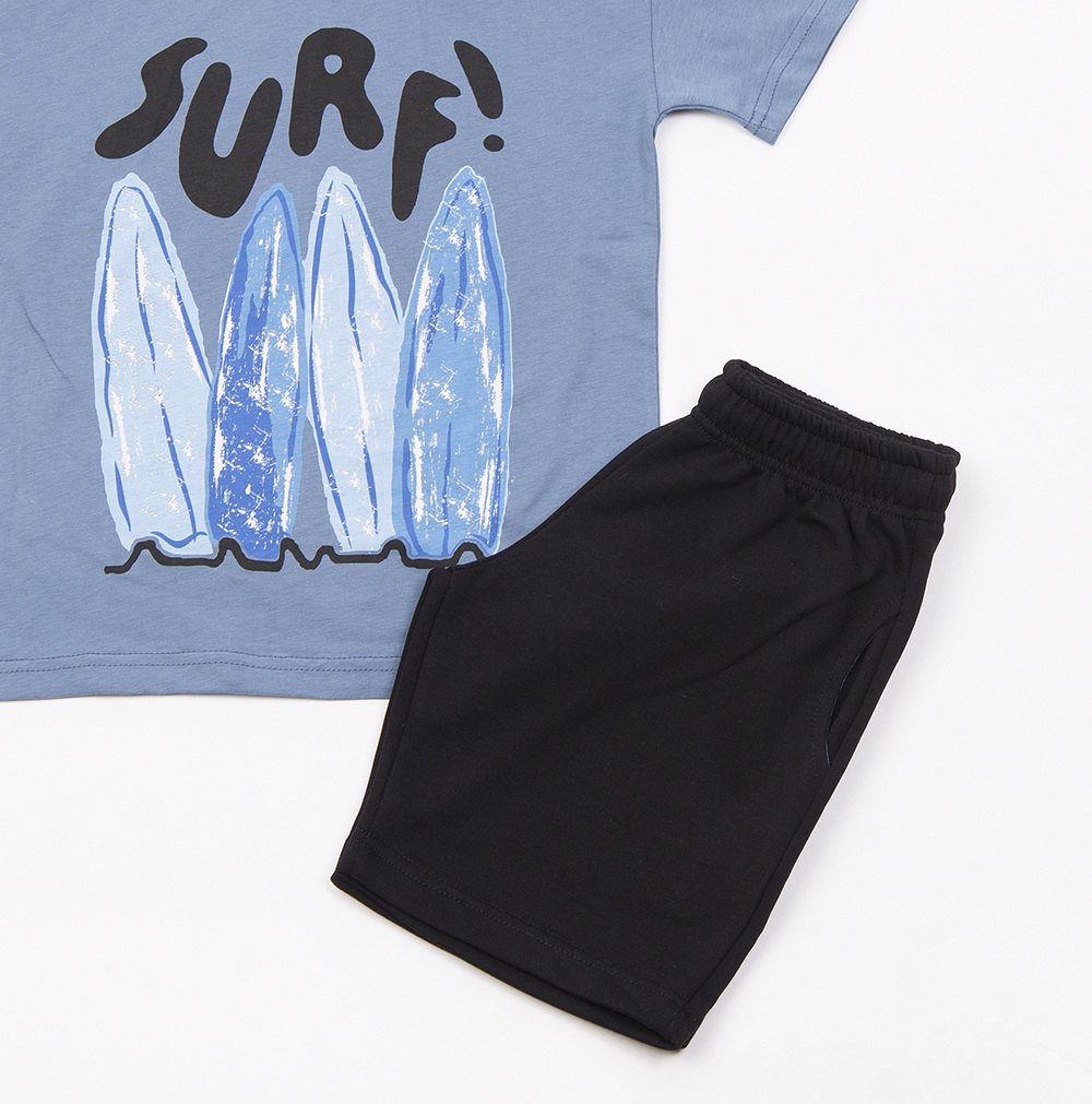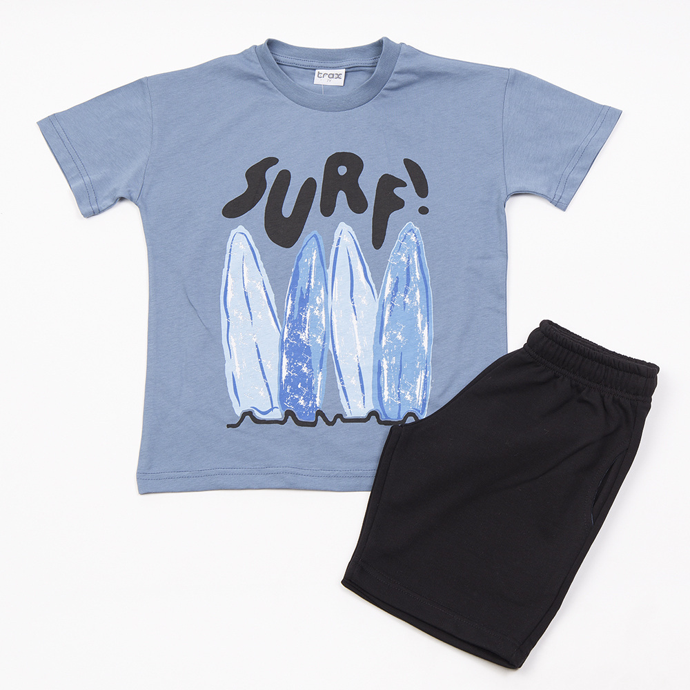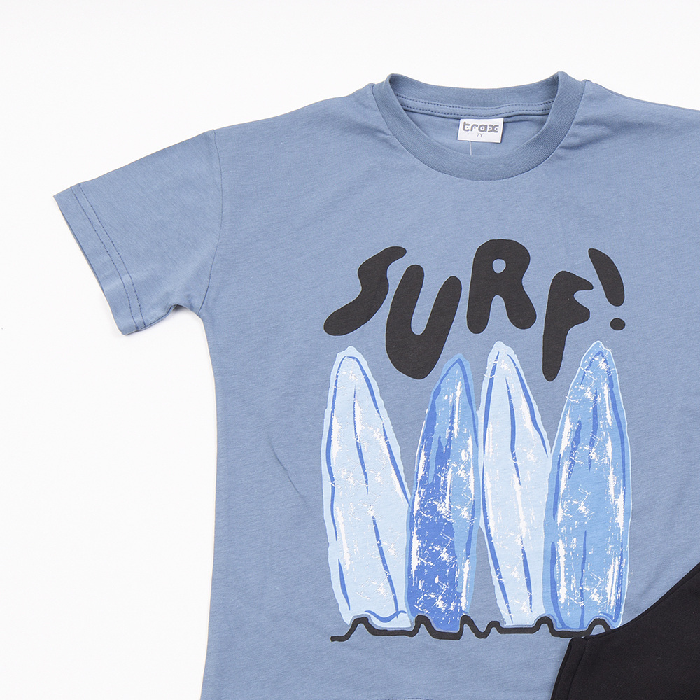 Βαμβακερό σετ TRAX, μπλούζα με τύπωμα "SURF" σε μπλε ραφ χρώμα και βερμούδα με λάστιχο και εσωτερικό κορδόνι στη μέση σε χρώμα μαύρο. Διαθέτει δύο εσωτερικές μπροστινές τσέπες.