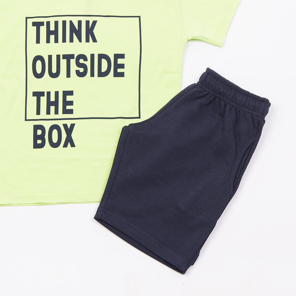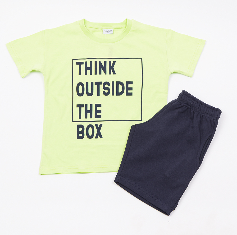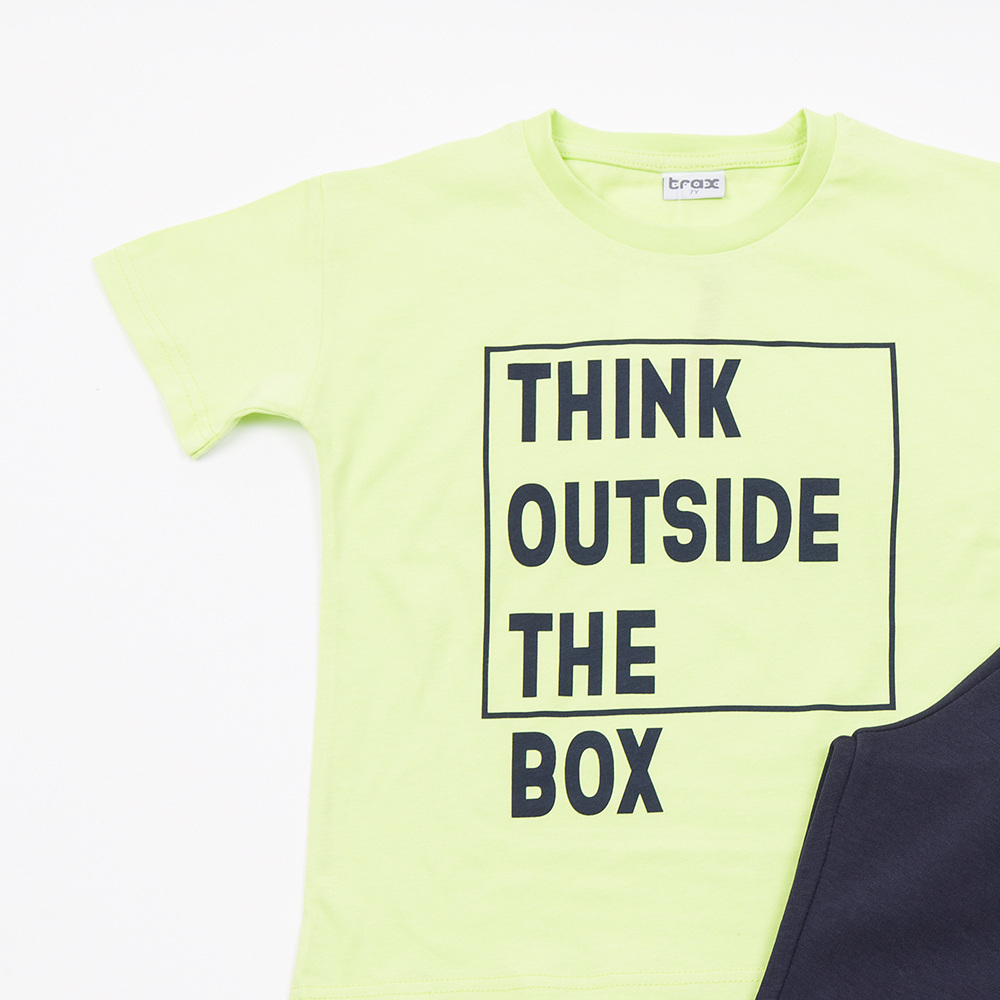 Βαμβακερό σετ TRAX, μπλούζα με τύπωμα "ΤΗΙΝΚ ΟUTSIDE ΤΗΕ ΒΟΧ" σε λάιμ χρώμα και βερμούδα με λάστιχο και εσωτερικό ρυθμιζόμενο κορδόνι στη μέση σε χρώμα μαύρο. Διαθέτει δύο εσωτερικές μπροστινές τσέπες.