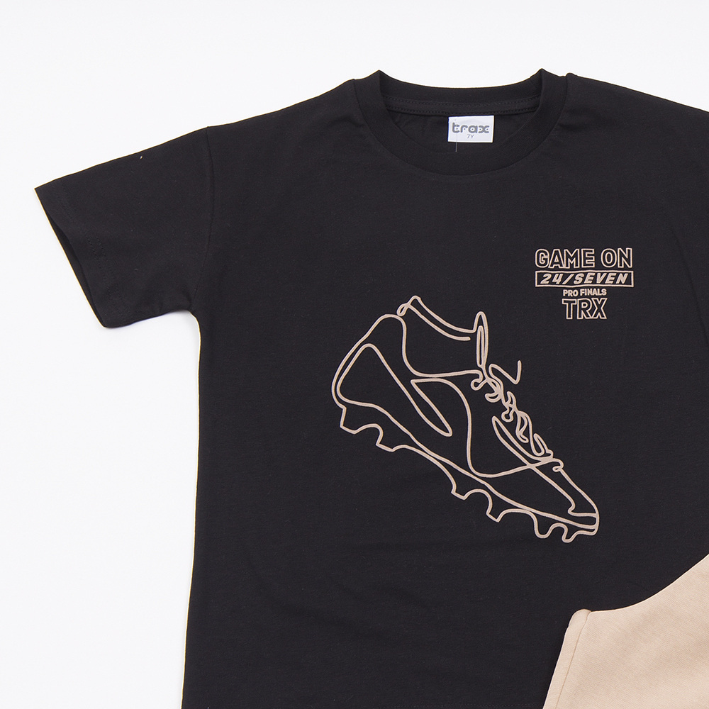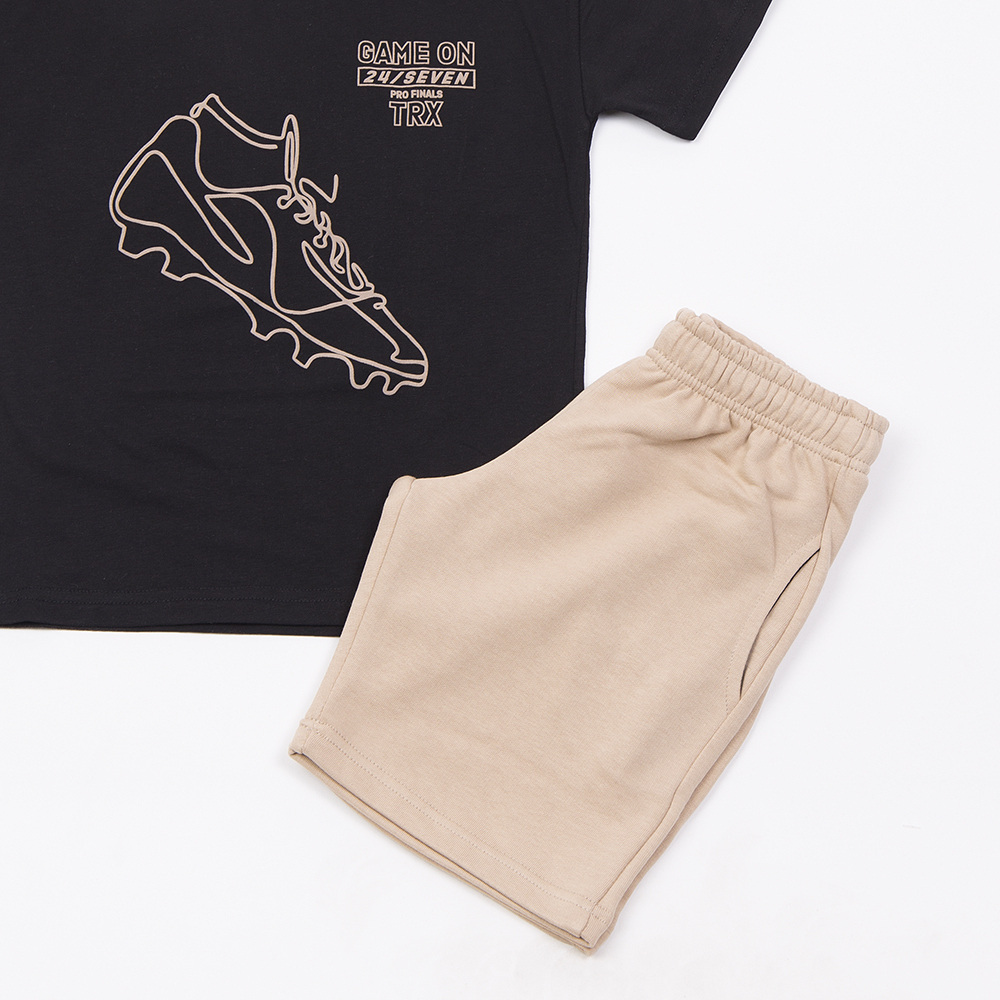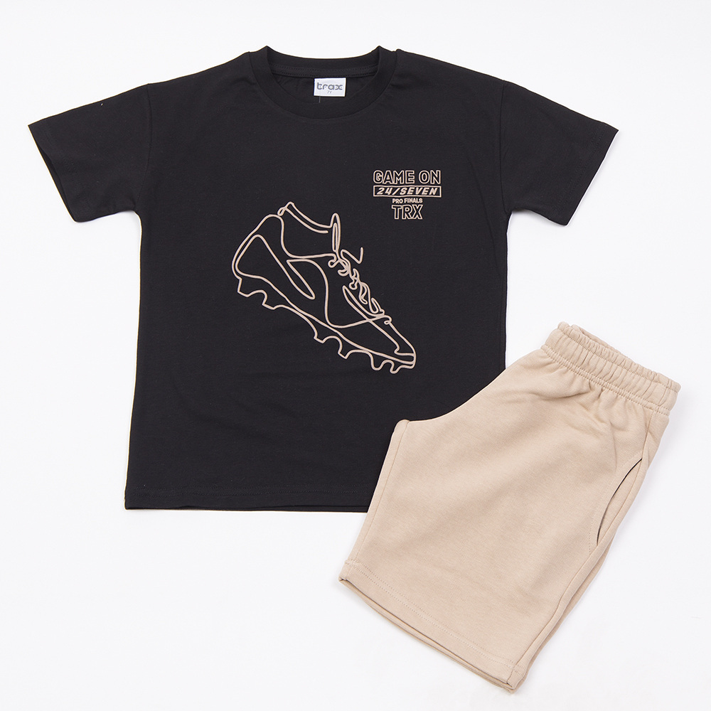 Βαμβακερό σετ TRAX, μπλούζα με τύπωμα στο μπροστινό μέρος σε χρώμα μαύρο και βερμούδα σε χρώμα μπεζ με ρυθμιζόμενο λάστιχο και εσωτερικό κορδόνι στη μέση.
