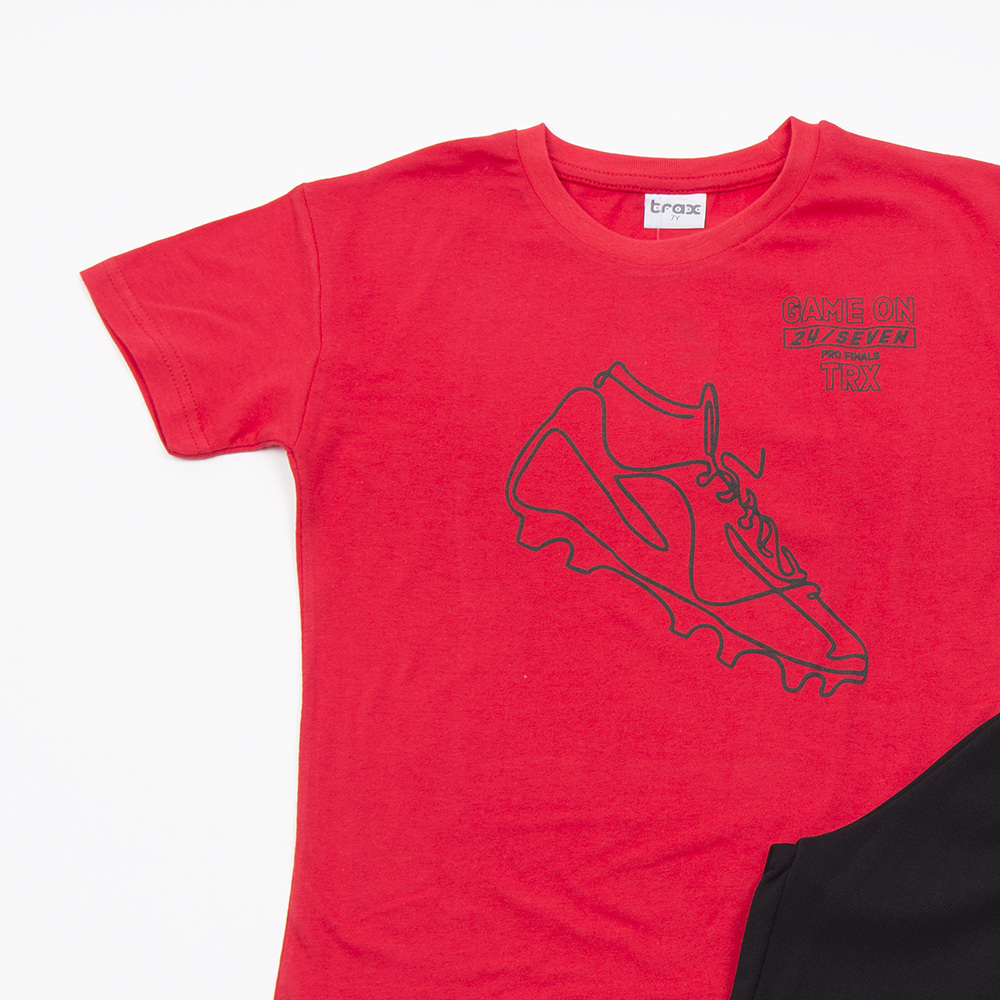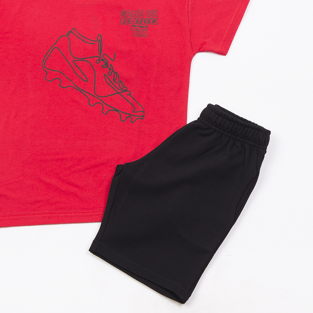 Βαμβακερό σετ TRAX, μπλούζα με τύπωμα στο μπροστινό μέρος σε χρώμα κόκκινο και βερμούδα σε χρώμα μαύρο με λάστιχο και εσωτερικό ρυθμιζόμενο κορδόνι στη μέση. Διαθέτει δύο εσωτερικές μπροστινές τσέπες.