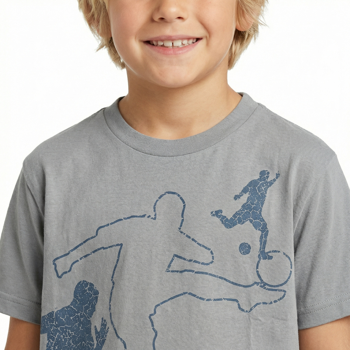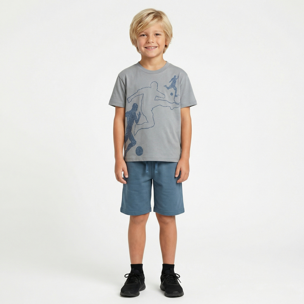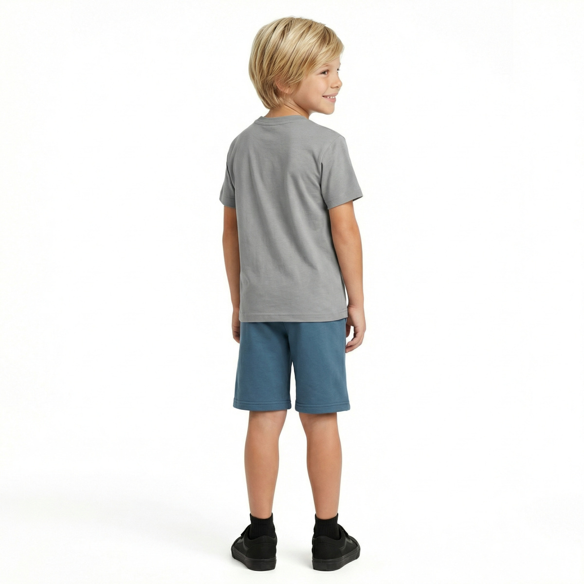 Βαμβακερό σετ TRAX, μπλούζα σε χρώμα γκρι ανοιχτό με τύπωμα στο μπροστινό μέρος και βερμούδα με λάστιχο και εσωτερικό ρυθμιζόμενο κορδόνι στη μέση σε χρώμα μπλε ραφ. Διαθέτει δύο εσωτερικές μπροστινές τσέπες.