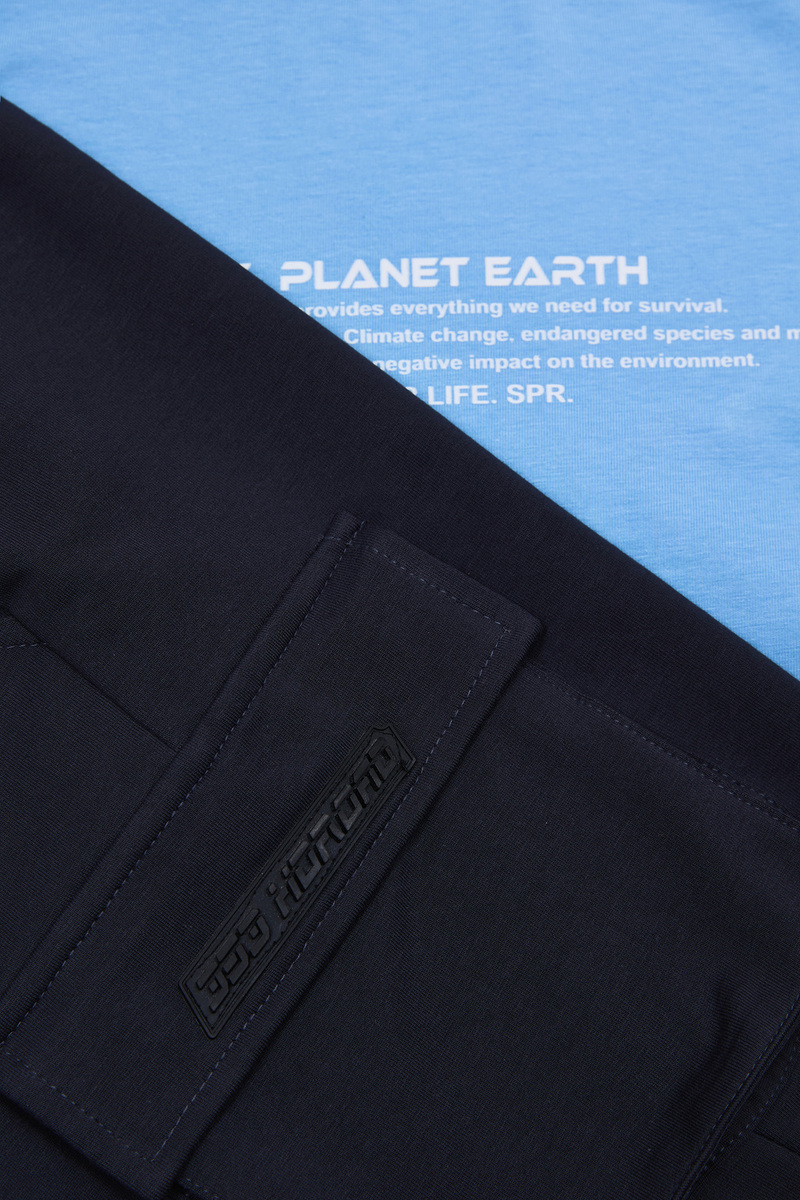 Βαμβακερό σετ SPRINT, μπλούζα σε χρώμα σιέλ, ανάγλυφο τύπωμα, στρογγυλή λαιμόκοψη και βερμούδα με ρυθμιζόμενο κορδόνι στη μέση σε χρώμα ανθρακί. Διαθέτει δύο μπροστινές εσωτερικές τσέπες και δύο τσέπες cargo στο πλάι.