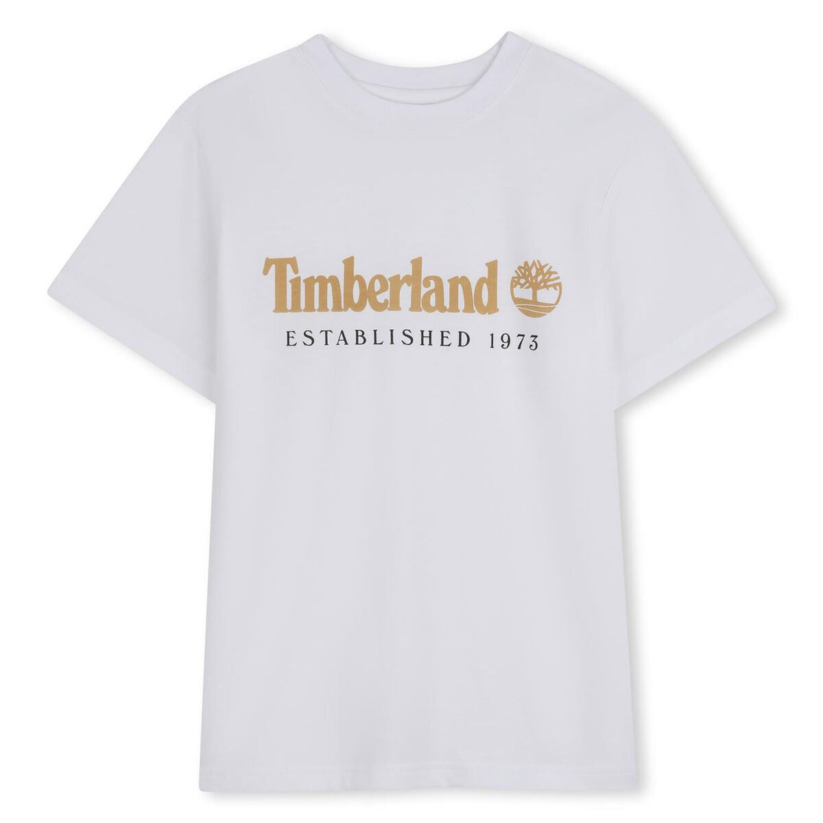Μπλούζα βαμβακερή TIMBERLAND σε λευκό χρώμα με στρογγυλή λαιμόκοψη και ανάγλυφο λογότυπο στο στήθος.