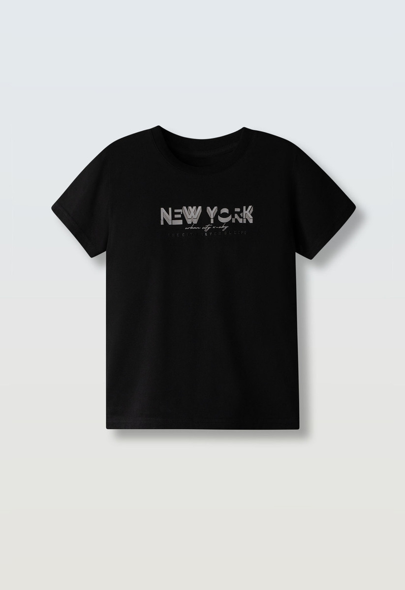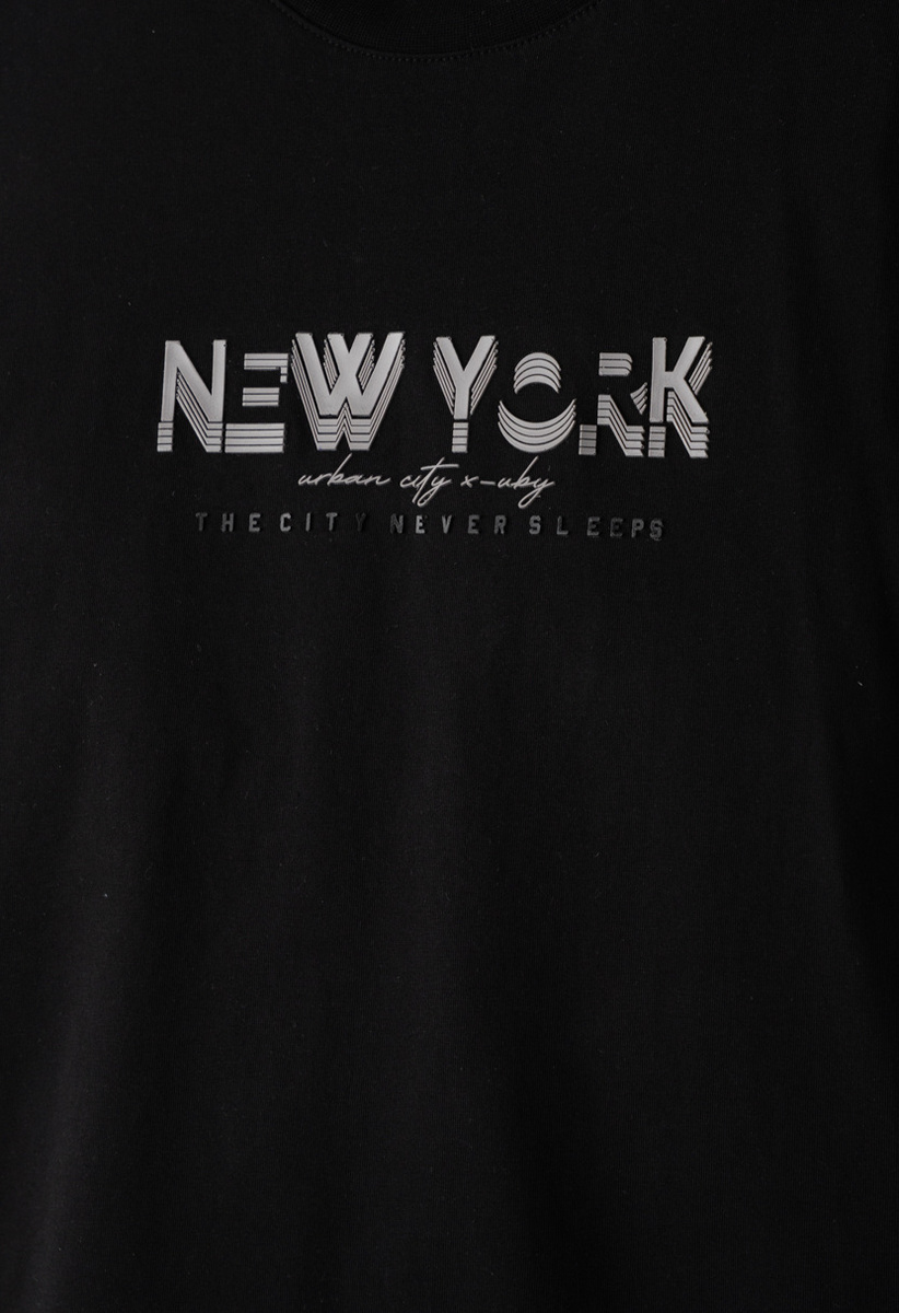 Μπλούζα βαμβακερή HASHTAG σε μαύρο χρώμα με στρογγυλή λαιμόκοψη και ανάγλυφο τύπωμα "NEW YORK" στο μπροστινό μέρος.