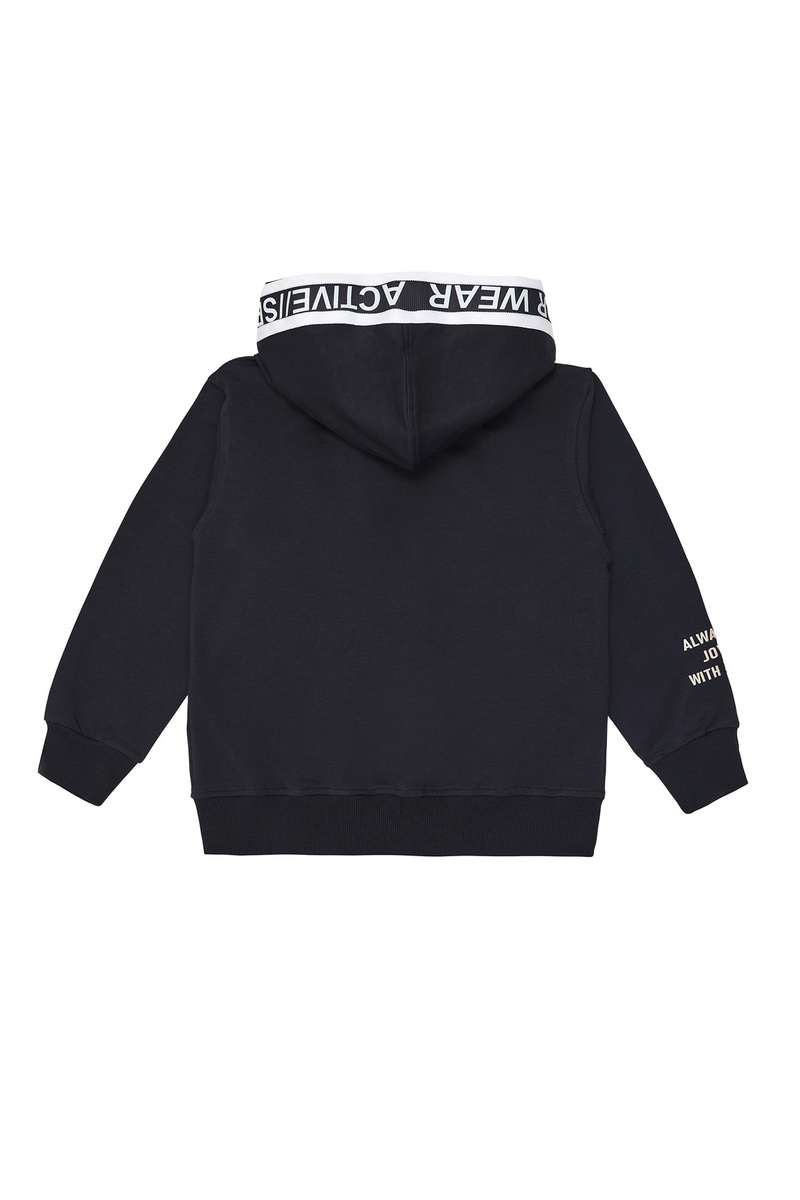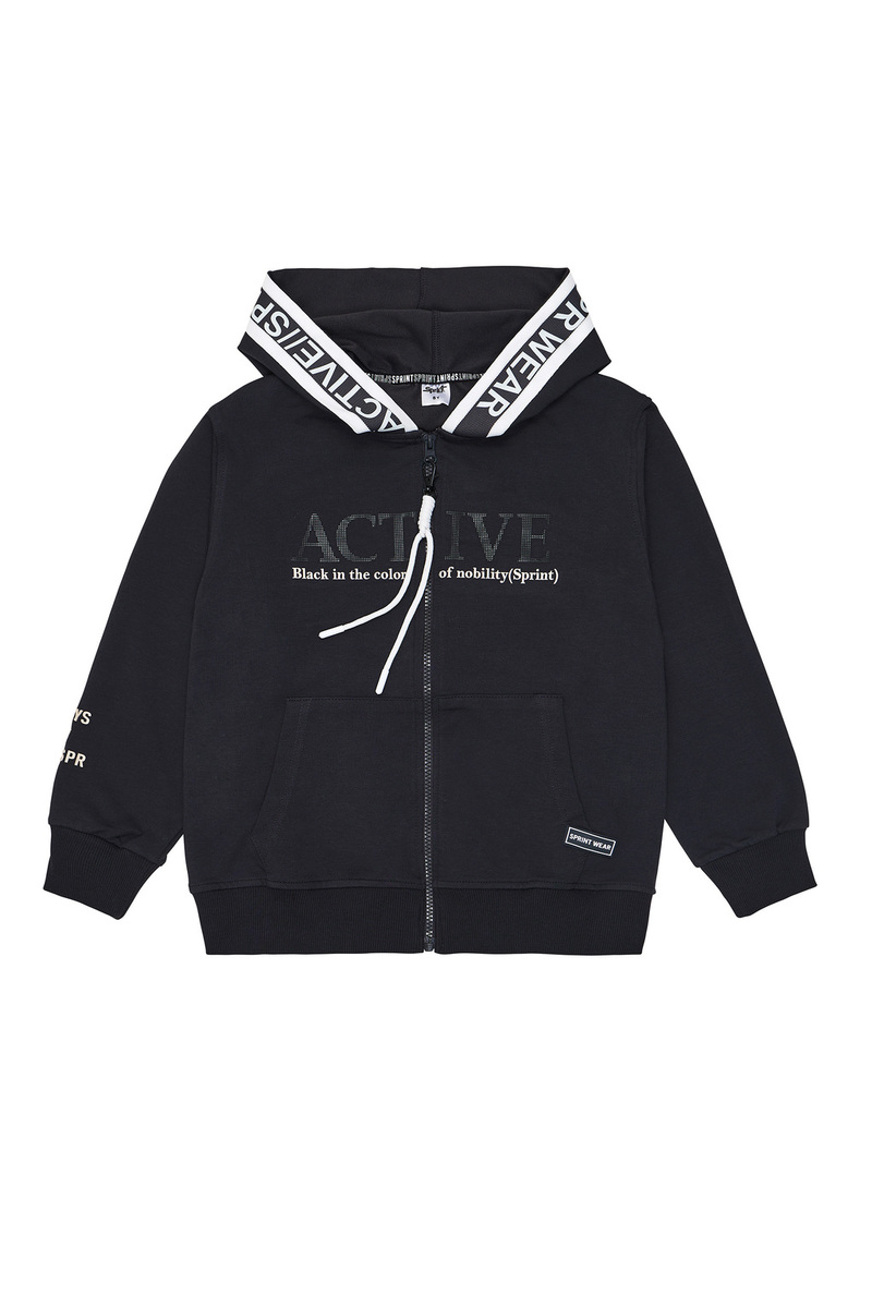 Ζακέτα SPRINT σε χρώμα ανθρακί με ενσωματωμένη κουκούλα, ανάγλυφο τύπωμα στο μπροστινό μέρος και κλείσιμο μπροστά με φερμουάρ. Διαθέτει δύο εξωτερικές τσέπες και ριπ λάστιχο στο τελείωμα στα μανίκια και στη μέση.
