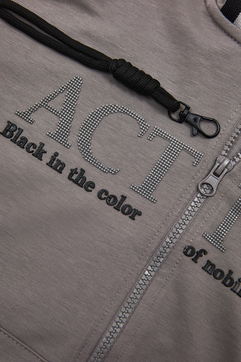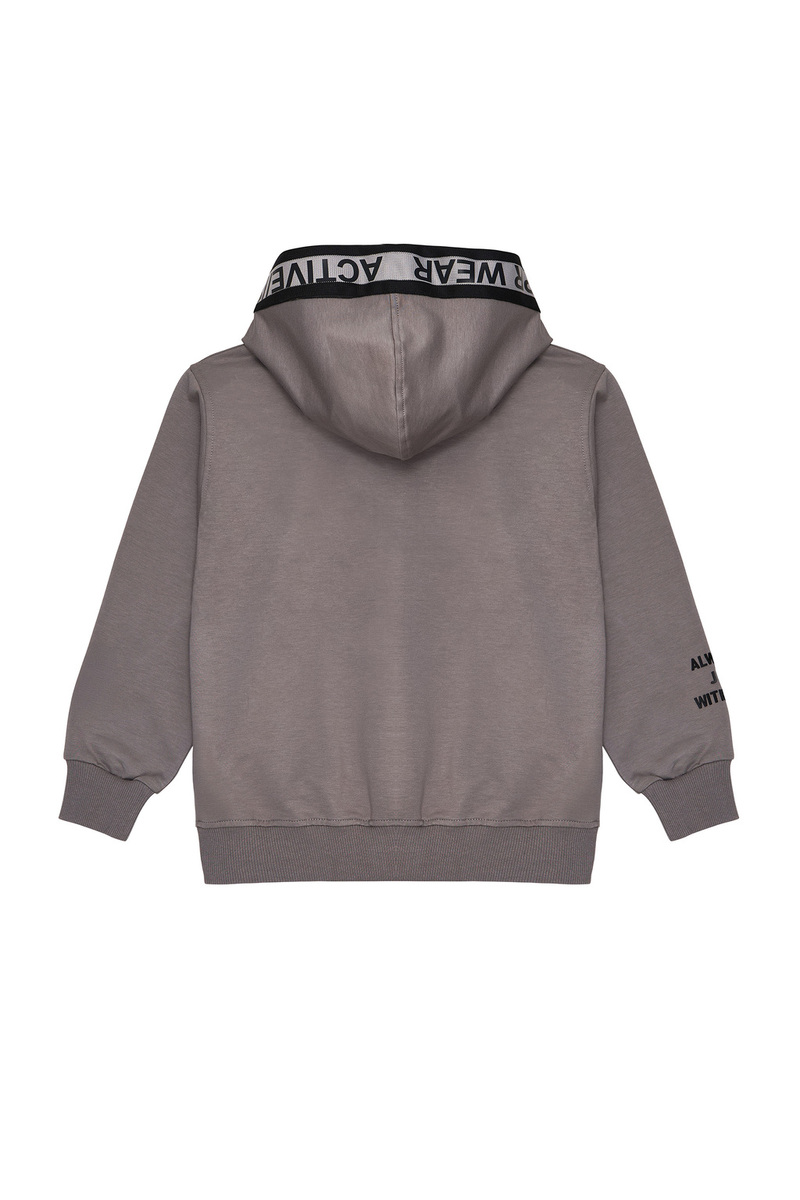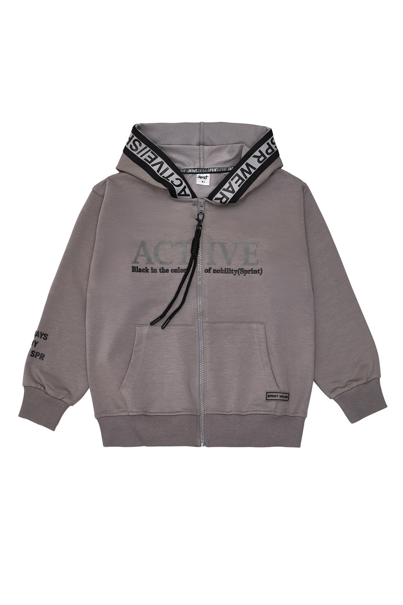 Ζακέτα SPRINT σε χρώμα γκρι με ενσωματωμένη κουκούλα, ανάγλυφο τύπωμα στο μπροστινό μέρος και κλείσιμο μπροστά με φερμουάρ. Διαθέτει δύο εξωτερικές τσέπες και ριπ λάστιχο στο τελείωμα στα μανίκια και στη μέση.