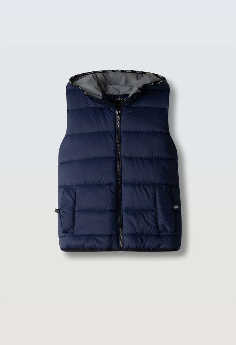 Μπουφάν αμάνικο HASHTAG σε μπλε σκούρο χρώμα με ενσωματωμένη κουκούλα, κούμπωμα με φερμουάρ και δύο εσωτερικές τσέπες στο μπροστινό μέρος.