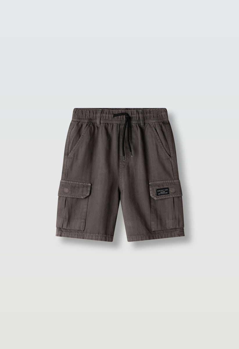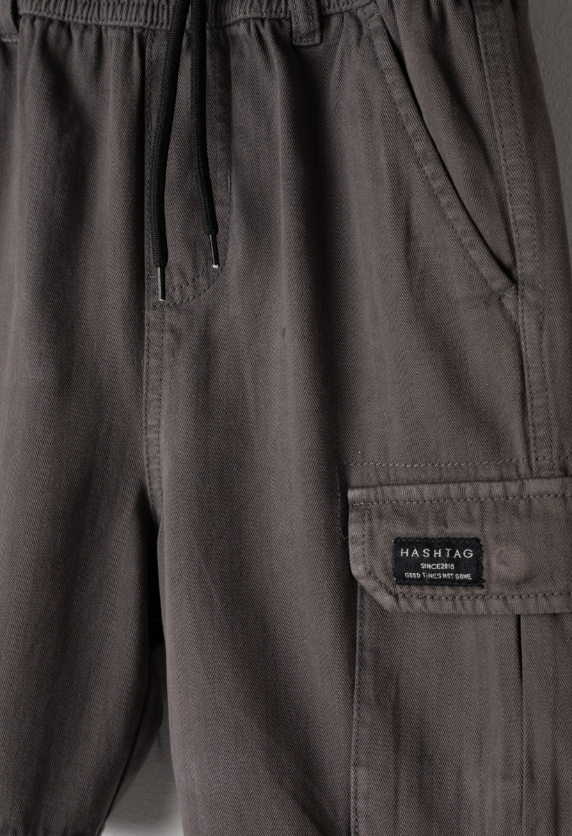 Βερμούδα HASHTAG σε ανθρακί χρώμα με εξωτερικές πλαινές τσέπες cargo και λάστιχο με ρυθμιζόμενο κορδόνι στη μέση για εύκολη εφαρμογή.