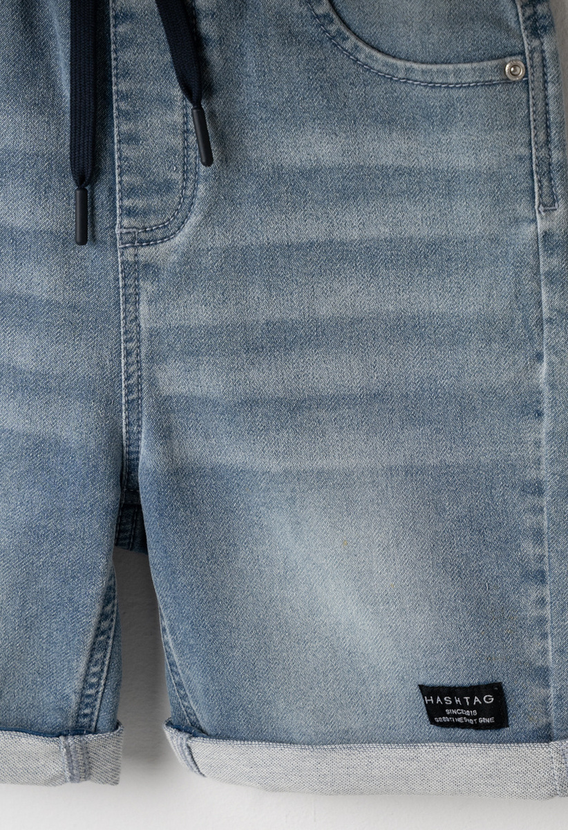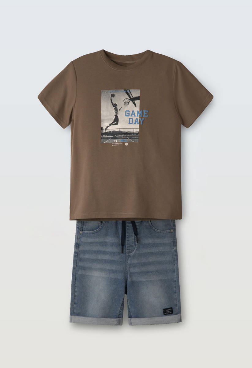 Σετ βερμούδα HASHTAG, μπλούζα βαμβακερή σε χρώμα καφέ με τύπωμα και βερμούδα τζιν με λάστιχο και ρυθμιζόμενο κορδόνι στη μέση σε χρώμα μπλε ανοιχτό.